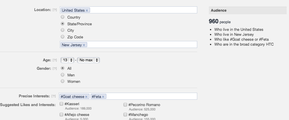 For instance, say you wanted to target all the feta cheese fans in New Jersey. Facebook lets you do just that.