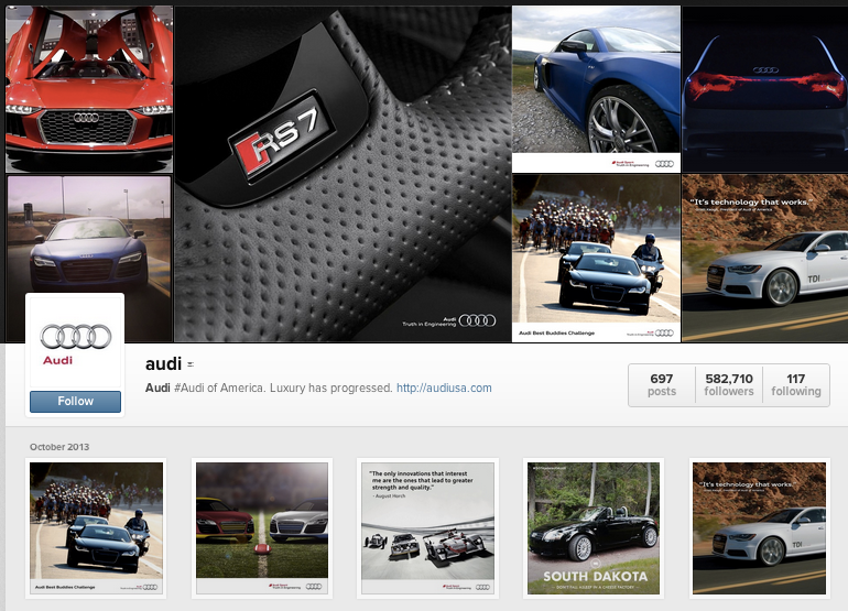 Sometimes social ads don’t even need to be ads. Berkowitz points to the Audi Instagram feed as an instance of non-advertising advertising. “Almost every image has an Audi logo in it,” he says. “And there are thousands of interactions with each post.”