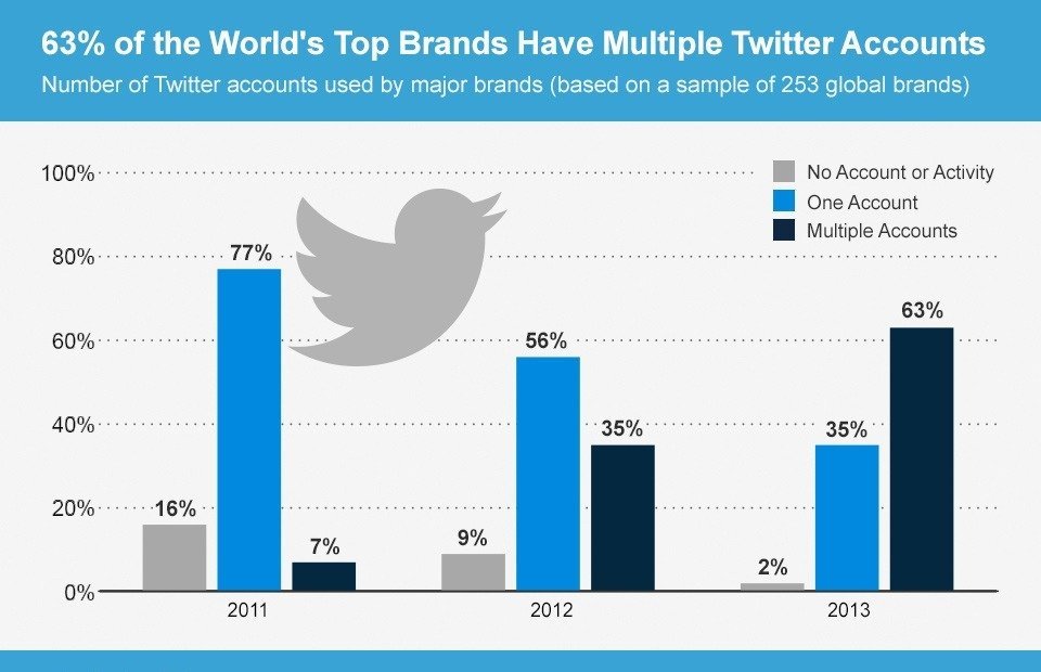In 2013, 63% of brands have multiple Twitter accounts, according to a report by Brandwatch. This trend represents an 800% increase from two years ago, when just 7% of brands had multiple Twitter accounts.