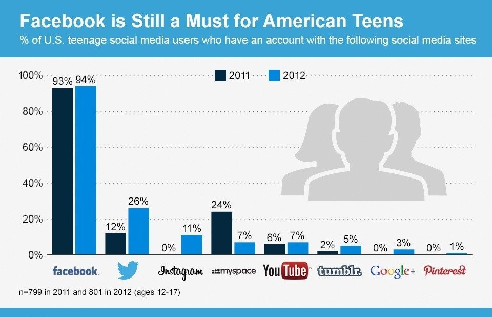 Facebook is still the No. 1 most popular social network among teens; its use increased from 93% to 94% between 2011 and 2012. The next most popular social network last year was Twitter, which is used by 26% of teens. Another chart-topper, Myspace, saw drastic drop-off between 2011 and 2012, from 24% to just 7%.