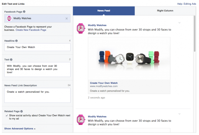 Once an objective has been identified, Facebook guides advertisers to the most appropriate ad. It’s up to the advertiser to choose where that ad appears — in the News Feed, for example, or alongside it.
